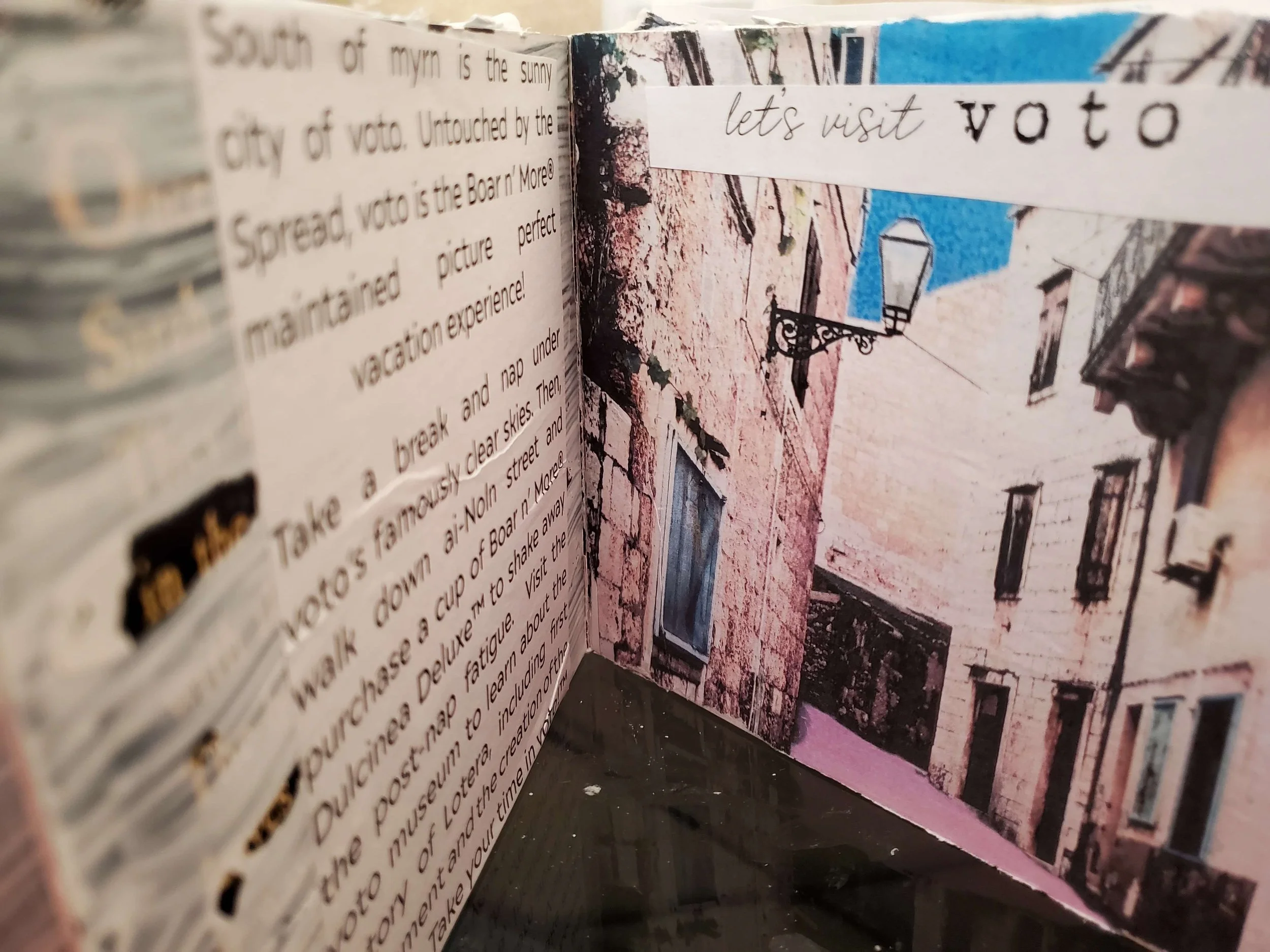 is an altered board book made with gesso, wheat paste and collaged text and images.